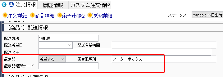 商品詳細の、【商品1】配送情報 内に、置き配関連の項目を追加しました。