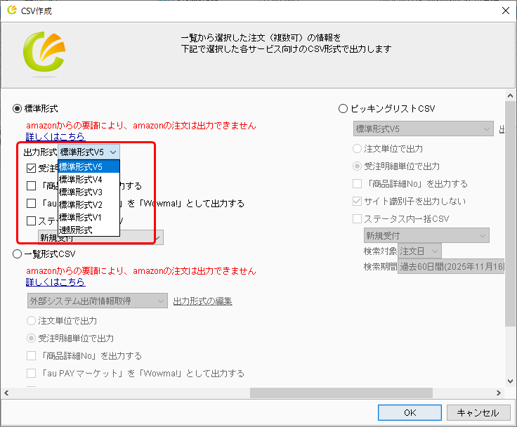 (標準形式V5、一覧形式CSVでの情報出力は可能です)